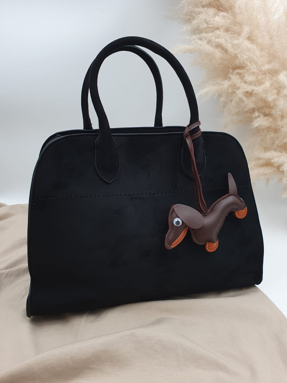 O acabamento macio e elegante traz um toque moderno, enquanto o chaveiro em formato de cachorro salsicha