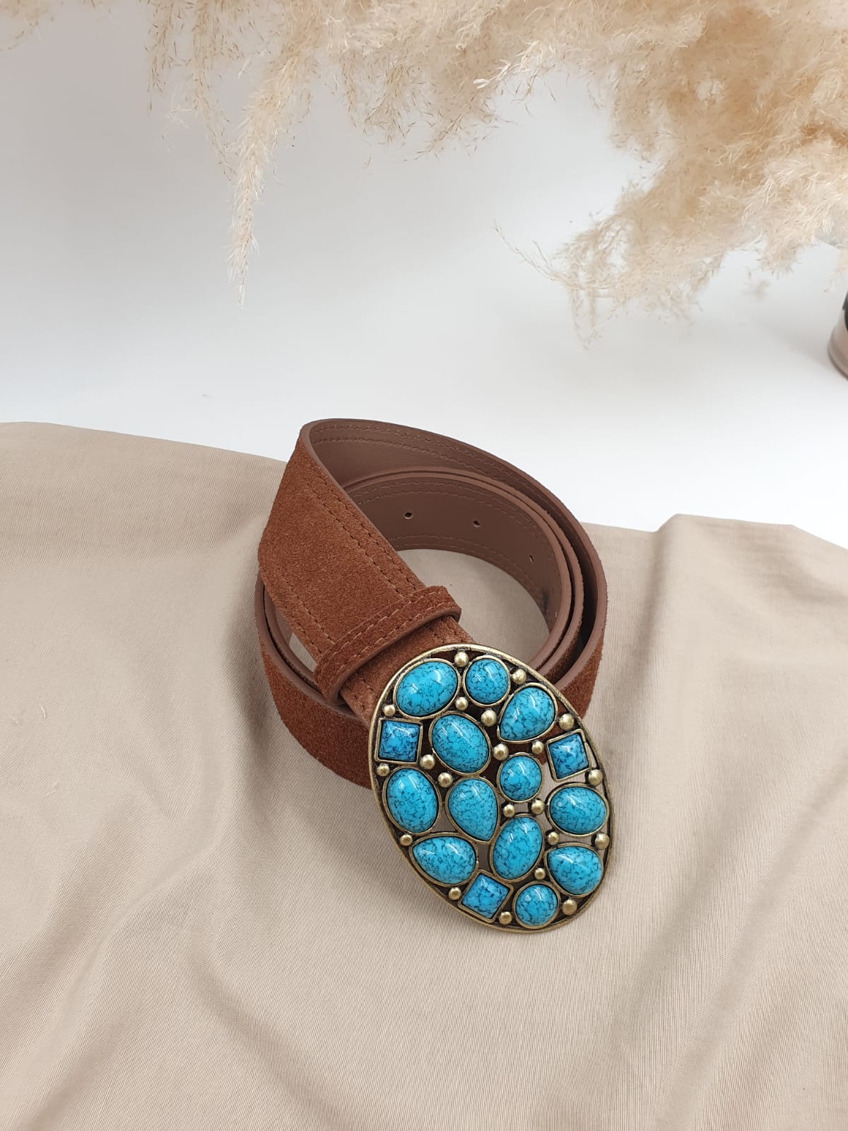 Cinto de Camurça, com fivela ouro velho, e resina azul.
